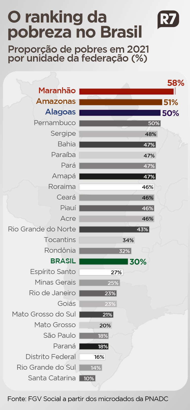 Na pandemia, o maior aumento foi em Pernambuco: de 8,14 pontos percentuais. As únicas quedas de pobreza ocorreram no Tocantins (0,95 ponto percentual) e em Piauí (0,03 ponto percentual).