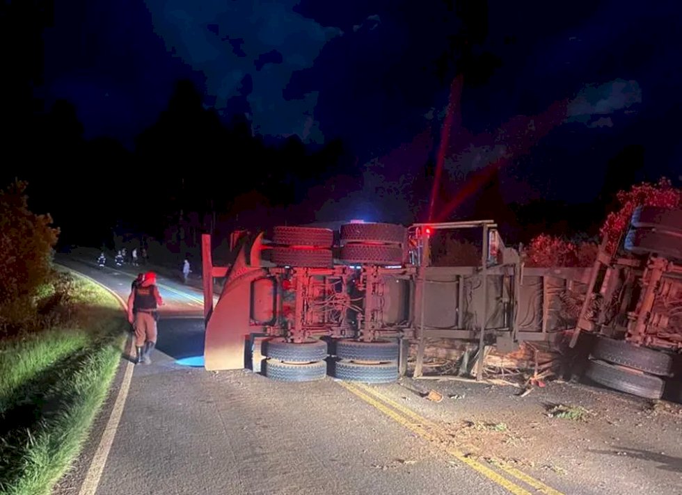 De acordo com a corporação, a carreta estava com dois semirreboques carregados de toras de eucalipto. A carga caiu e esmagou os veículos.