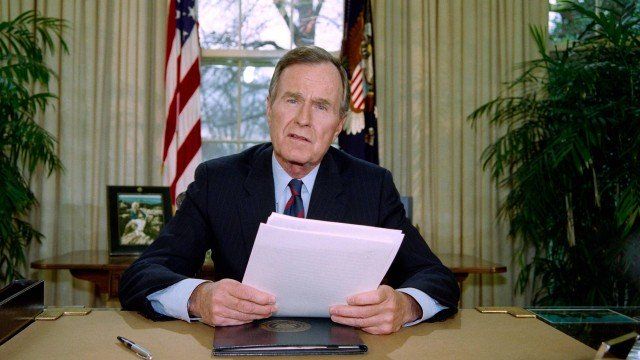 Republicano, Bush se destacou durante seu único mandato por ter decidido pela intervenção das forças norte-americanas no Iraque na guerra do Golfo, depois que as forças de Saddam Hussein invadiram o Kuwait. Antes de ocupar a presidência, ele foi vice-presidente durante os oito anos da administração Reagan, diretor da CIA e congressista.