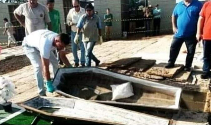 Com o apoio de um médico, a quadrilha então falsificou o atestado de óbito e fez o “enterro” da mulher no cemitério Nossa Senhora do Carmo, em um caixão lacrado “por ordens médicas”. Dois meses depois, uma integrante do grupo tirou a certidão de óbito em um cartório da cidade, que serviria para resgatar o dinheiro das apólices. A Polícia Civil, no entanto, desvendou o golpe. Durante a investigação, o caixão foi desenterrado e ficou comprovado que não havia corpo, como se pode ver na foto compartilhada nas redes sociais. No interior havia apenas uma pedra e um saco de serragem. O site São Carlos Agora mostra toda a operação em uma galeria de imagens.