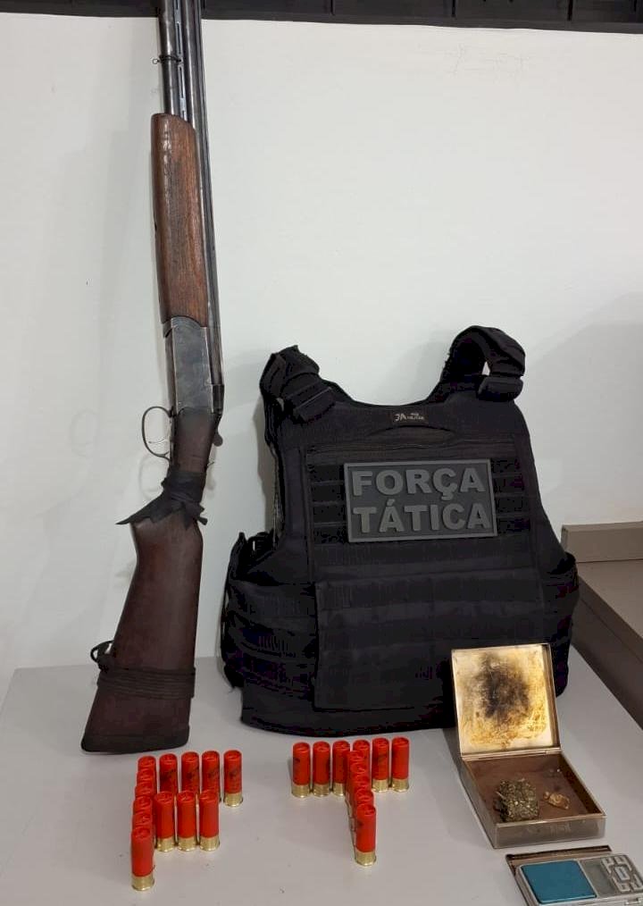 Durante buscas no imóvel, a equipe localizou e apreendeu uma espingarda calibre 12, com dois canos, 24 munições intactas, porções de crack e maconha, além de uma balança de precisão, evidenciando a prática dos crimes de tráfico de drogas (artigo 33 da Lei nº 11.343/2006) e posse irregular de arma de fogo de uso permitido (artigo 12 da Lei nº 10.826/2003).