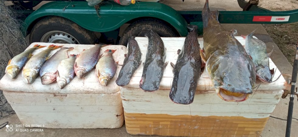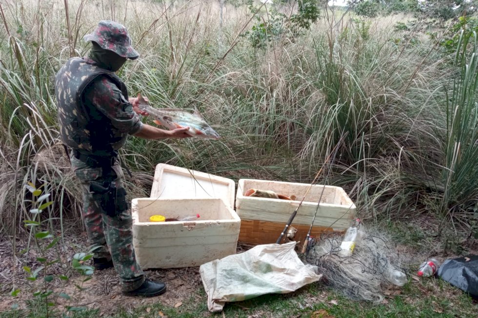 Nas proximidades da região conhecida como Porto XV, a equipe avistou pessoas praticando pesca de barranco. Ao realizarem uma vistoria técnica na mata ciliar, os policiais localizaram uma trilha que levava ao interior da vegetação. Escondidas entre o capim, foram encontradas duas caixas de isopor contendo diversos exemplares de peixes, alguns deles com restrições de captura ou tamanhos específicos: